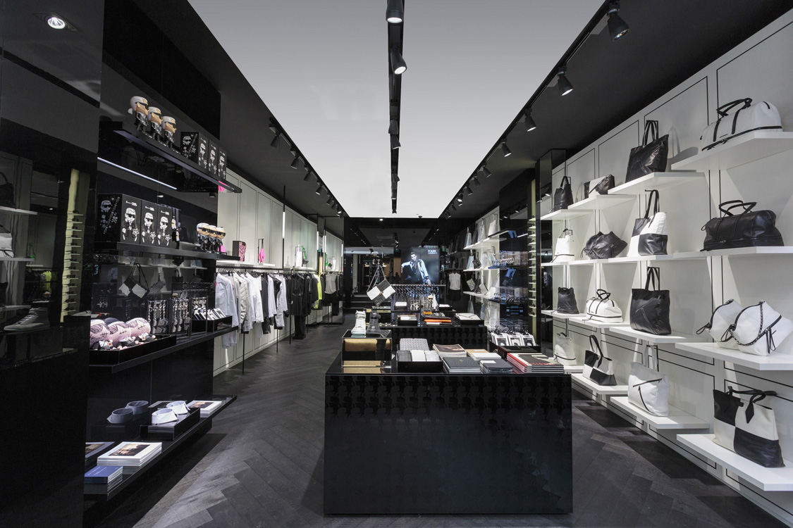 Es lohnt sich wirklich! Die Desingstücke sind allesamt spannend und qualitativ hochwertig. Selbst der kleinste Schlüsselanhänger strahlt die Lagerfeldsche Eleganz, aber auch seine Ironie, aus. Klamotten sind teilweise erstaunlich erschwinglich, die Preise bleiben deutlich unter der 1000,00 Euro Marke. Es bleibt allerdings auch ein Gefühl von H&M in teuer, wenn man durch die heilige Halle schreitet. Von der aufgeregten und teilweise seltsamen Menschenmenge, die den Store meist bevölkert, mal ganz abgesehen. Leute, die sich niemals in einen Couture Laden trauen würden, geschweige denn dort Geld ausgeben könnten, stehen nun breitbeinig vor derben Militärstiefeln in KL-schwarz und schiessen Fotos, als wären sie gerade mit dem Flieger aus Japan gekommen. KL für Alle, jawoll! Und insgeheim hoffen wohl alle, dass der Meister persönlich um die Ecke gerauscht kommt, eine seiner Signature-Püppchen gerade rückt und laut schnatternd an ihnen vorbei eilt…
