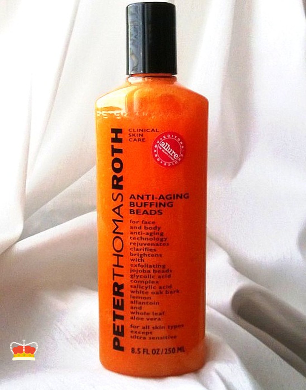 „Dieses ultramilde Anti-Aging Peeling für Gesicht und Körper enthält Glykolsäure, Salicylsäure und botanische Aufheller, um überschüssige Hautschüppchen zu entfernen und die Haut zu klären. Die Haut wirkt sofort strahlender, ebenmäßiger und jünger. Ultrafeine Jojobaperlen wirken zweifach: Sie entfernen abgestorbene Hautzellen ohne die Haut zu irritieren und ermöglichen eine bessere Aufnahme von anschließend aufgetragenen Pflegeprodukten. Außerdem verfeinern sie das Hautbild, der natürliche Hauterneuerungsprozess wird stimuliert. Feine Linien, Fältchen und Pigmentierungen werden sichtbar reduziert.“