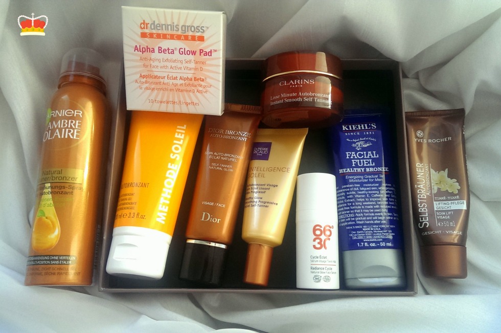 1. Garnier Ambre Solaire: Selbstbräunerspray ( Praktisch, man muss sich nicht großartig einschmieren. Dafür fliegt aber auch die Hälfte daneben. Vorsicht: Rutschgefahr im Bad! Schön: Ohne Alkohol, aber mit einer Portion Vitamin E. Der Geruch ist erträglich, man nimmt den Selbstbräunerduft kaum wahr, ist aber auch deutlich mit blumigen Düften übertüncht! Die Farbe ist recht natürlich, aber auch stark, es arbeitet DHA. Eher für dunklere Hauttypen geeignet! 150ml ca. € 5,95)