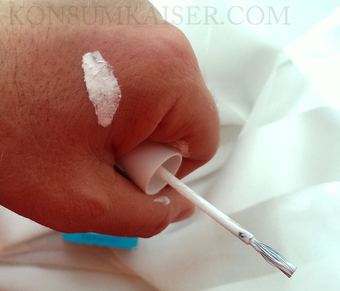 Danach ging es in den (daneben liegenden) Rossmann Markt. Dort kaufte ich einen Pickeltupfer von Essence: „SOS Spot Killer“ und das Rival De Loop „Pure Skin Fruchtsäure Peeling“. Ich kann mich gar nicht entscheiden welches Produkt schlechter ist!! Der Pickeltupfer ist in Wirklichkeit ein Pickel-PINSEL! Wusste ich nicht, drehte die längliche Flasche unvorsichtig auf und hatte die ganze Pampe auf der Hand, auf der Hose und auf dem Boden. Lecker! Weiss wie Deckweiss soll es auf den Pickel gepinselt werden und dort über Nacht sein Werk tun. Man muss nur sicherstellen, dass niemand sonst anwesend ist, man könnte nämlich meinen man liegt neben einem Malergesellen, der nicht viel vom Duschen hält! Schlimmes Zeugs! Die Inhaltsstoffliste ist noch schrecklicher! Es geht sofort auf Platz 1 los mit Alkohol, was eine stark fettende Haut demnächst garantiert. Der super Pickelwirkstoff „Salicylsäure“ ist nicht vorhanden, also völlig „von gestern“! Und dann auch noch Parfum in einem Anti-Pickel Produkt. Oh jeh! 7ml für ca. € 3,49