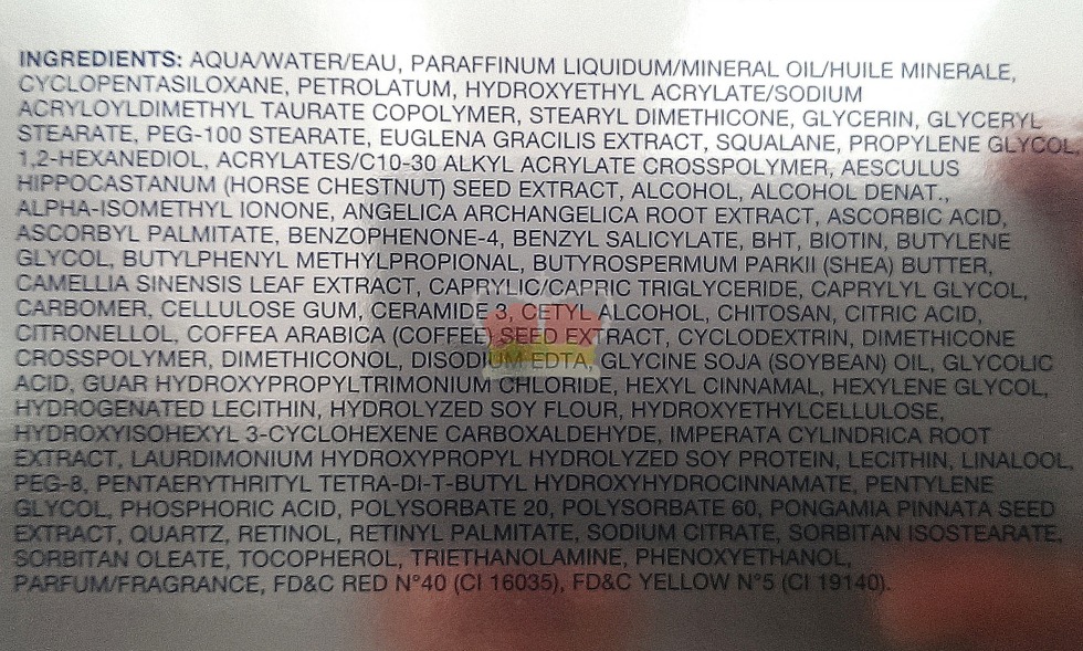 AQUA/WATER/EAU, CYCLOPENTASILOXANE, DICAPRYLYL ETHER, PHENYL TRIMETHICONE, GLYCERIN, LAURYL PEG-10 TRIS(TRIMETHYLSILOXY)SILYLETHYL DIMETHICONE, MICA, SODIUM CHLORIDE, POLYETHYLENE, 1,2-HEXANEDIOL, ACRYLATES/C10-30 ALKYL ACRYLATE CROSSPOLYMER, ALCOHOL, ALPHA-ISOMETHYL IONONE, ANGELICA ARCHANGELICA ROOT EXTRACT, ASCORBIC ACID, ASCORBYL PALMITATE, BEHENTRIMONIUM CHLORIDE, BENZYL SALICYLATE, BHA, BHT, BIFIDA FERMENT LYSATE, CAMELLIA SINENSIS LEAF EXTRACT, CAPRYLYL GLYCOL, CELLULOSE GUM, CHITOSAN, CITRIC ACID, CITRONELLOL, CITRUS AURANTIUM AMARA (BITTER ORANGE) PEEL EXTRACT, COFFEA ARABICA (COFFEE) SEED EXTRACT, DIMETHYLMETHOXY CHROMANOL, DISTEARDIMONIUM HECTORITE, ETHYLHEXYLGLYCERIN, GLYCINE SOJA (SOYBEAN) OIL, GLYCOLIC ACID, GLYCYRRHIZA GLABRA (LICORICE) ROOT EXTRACT, HEXYL CINNAMAL, HYDROGENATED VEGETABLE OIL, HYDROLYZED SOY FLOUR, ISOPROPYL ALCOHOL, LECITHIN, LINALOOL, MAGNESIUM ALUMINUM SILICATE, MALTODEXTRIN, PEG-8, PLANTAGO LANCEOLATA LEAF EXTRACT, POLYSORBATE 20, PONGAMIA PINNATA SEED EXTRACT, POTASSIUM PHOSPHATE, PROPYLENE CARBONATE, PTFE, RETINOL, SCLEROTIUM GUM, SILICA, SODIUM POTASSIUM ALUMINUM SILICATE, SORBITAN OLEATE, SORBITAN STEARATE, SYNTHETIC FLUORPHLOGOPITE, TIN OXIDE, TOCOPHEROL, XANTHAN GUM, PHENOXYETHANOL, SODIUM BENZOATE, SORBIC ACID, PARFUM/FRAGRANCE, TITANIUM DIOXIDE (CI 77891), FD&C RED N°40 (CI 16035)