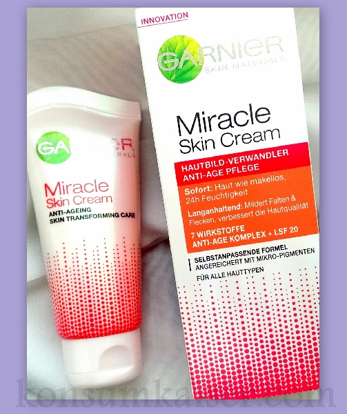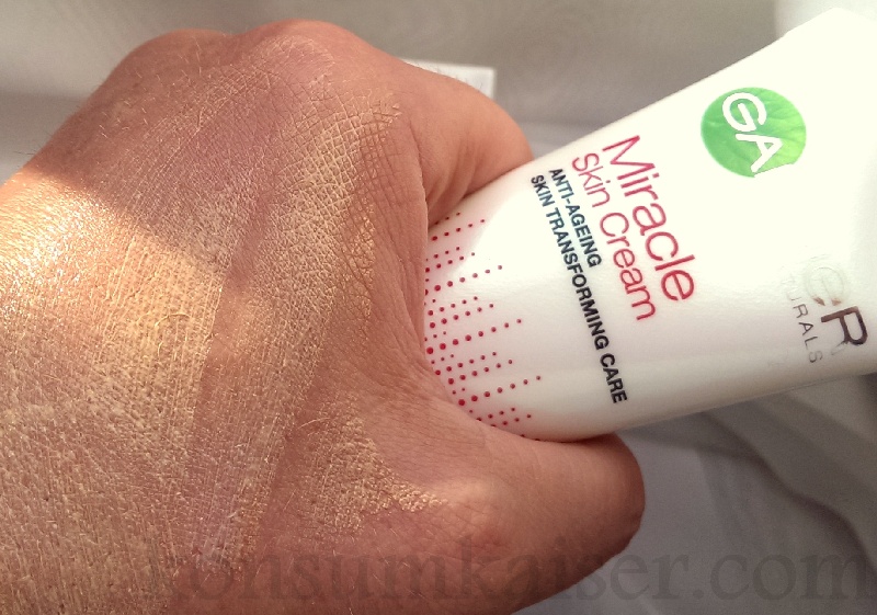 Für die Garnier Miracle Skin Cream wurde eine völlig neue Formel entwickelt, die das Hautbild mit sieben verschiedenen Anti-Age-Wirkstoffen und integriertem Lichtschutzfaktor 20 schützt und im Hand-umdrehen eine ebenmäßige und strahlende Haut zaubert. Die spezielle Wirkstoff-Kombination verändert die Haut bereits bei der ersten Berührung und lässt die Haut sofort makellos erscheinen.“