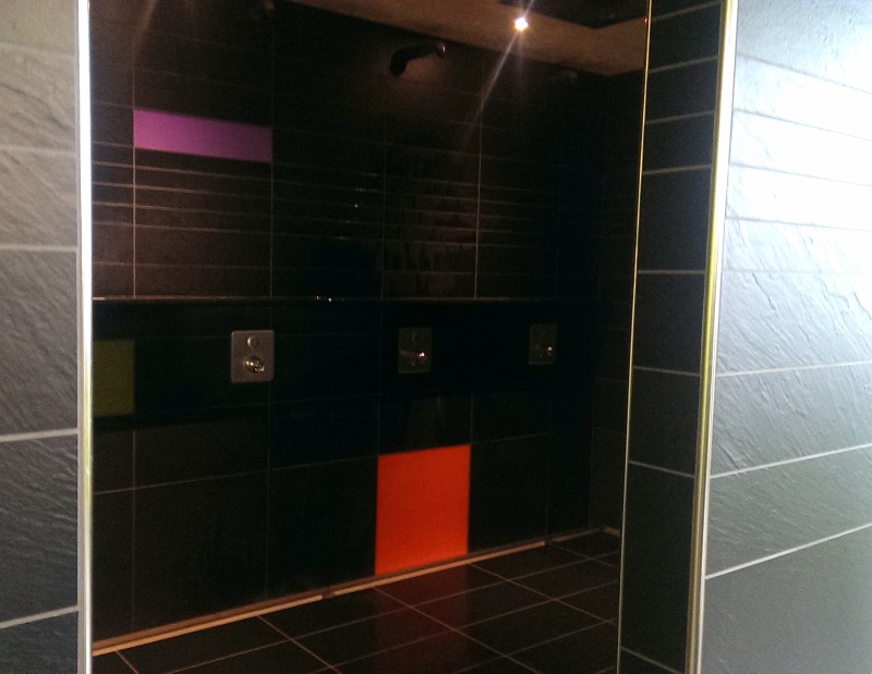 Die Duschen liegen in einem milden Dämmerlicht, Wände und Böden sind alle sehr, sehr dunkel gehalten. Was nicht gut für sichtbare Wasserflecken ist, schmeichelt der Figur aber ungemein. Wenn die feinen Wasserperlen langsam und warm am erhitzten Körper herunterrinnen, dann ist der schimmernde Körper in ein blendfreies, der Abendsonne sehr ähnliches, Licht getaucht. Dazu prangt ein Schild am Eingang neben der Dusche: Es ist Duschen in Badehose/Badeanzug ausdrücklich erlaubt! (soso…)