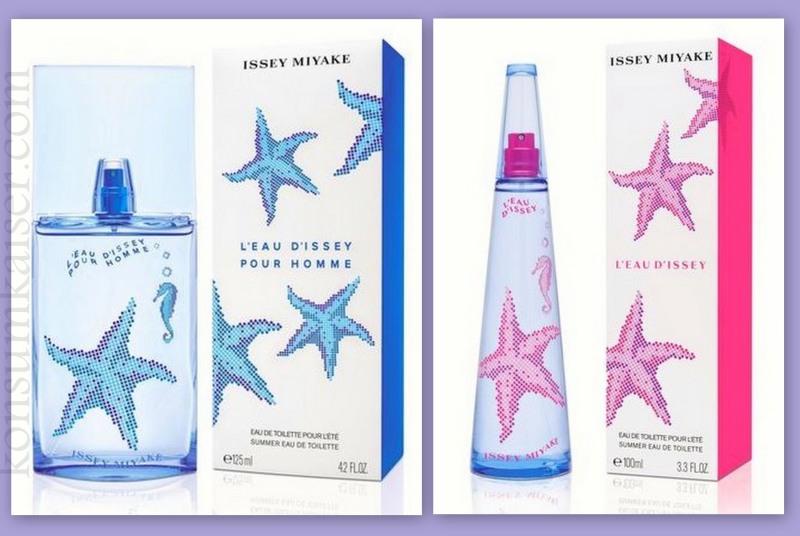Die beiden Düfte präsentieren sich in einem originellen, sommerlichen Look mit pinken und blauen Seepferdchen und Seesternen auf den bekannten Silhouetten der Flakons und den Etuis: Issey Miyake‘s ansteckend fröhliche Interpretation von Sommer!