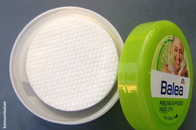 „Balea sanfte Intensiv-Pfegeserie für klare, schöne Haut. Die Formulierung mit milder aloe Vera reinigt und pflegt die Haut. Mit der Peeling-Oberfläche entfernen Sie schonend die Hautschüppchen, mit der weichen Pflege-Oberfläche verfeinern und pflegen Sie Ihr Hautbild.“ 30 Pads kosten ca. € 1,99