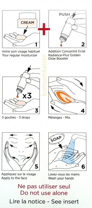 Verwendet wird der Clarins Tröpfel-Bräuner dann ganz, ganz einfach. Es werden 4-5 Tropfen (ich nehme 6, ich brauche etwas MEHR Farbe, mein Grundton ist eh leicht braun) in egal welche Creme gemischt. Von Fettcreme bis mattierendem Serum, alles geht. Es gibt keine Auswirkungen auf den zu erwartenden Farbton! Nur bei AHA Cremes wäre ich vorsichtig, das passt nicht!