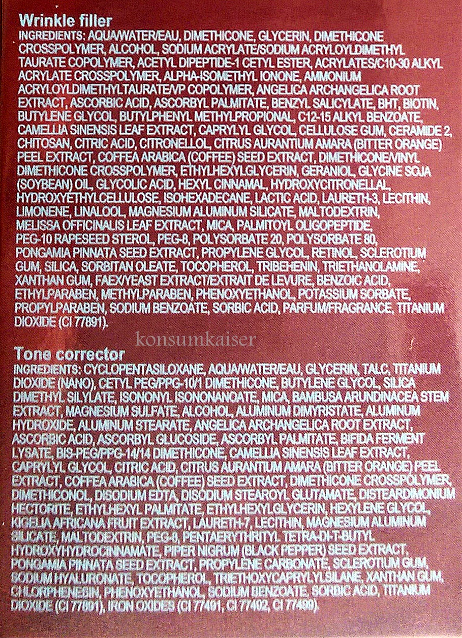 English: The Lancaster Suractif Fill & Perfect Wrinkle Eraser is the first combination product of its kind. With 2 targeted formulas for a perfectly radiant, youthful appearance. One end of this unique anti-aging skin care helps to correct wrinkles, conceals and covers skin irregularities. The Fill & Perfect complex supporting the natural structure of collagen & hyaluronic acid in your skin and helps fill wrinkles every day non-stop. In addition, Lancaster Suractif Fill & Perfect Wrinkle Eraser features reflecting pigments, even leave the deeper wrinkles appear reduced immediately. The subtile Concealer covers with its slightly tinted texture wrinkles, signs of fatigue and skin irregularities. Fragrance, silicones and alcohol are on board, but in small amounts. You better use this product punctually every second day. For every day use i recommend a good power-serum and a well-tolerated night cream for a real anti-aging effect.
