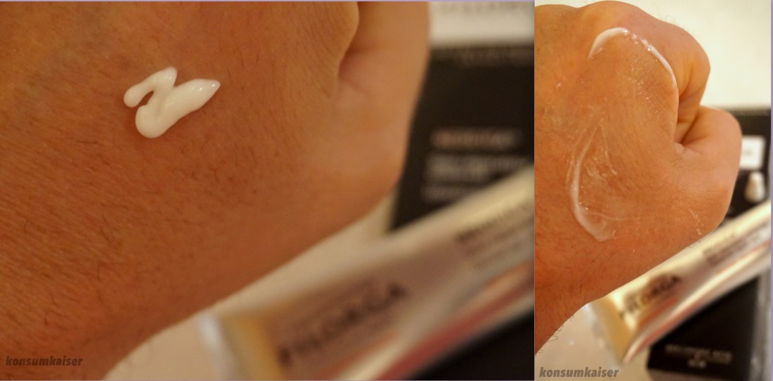 Ich kann bestätigen, dass diese emulsionsartige Pflege wirklich gut bei meiner Haut ankommt. Nach ein paar Wochen der Anwendung reicht dann auch bereits ein zweimaliges Auftragen, die Haut ist dann schön „versorgt“ (wie wir Blogger ja immer gerne zu sagen pflegen) und es gibt einen Indikator für mich, an welchem ich erkenne, dass eine Hautpflege gute Arbeit leistet: Ich muss mir keine Gedanken um meine Haut machen und „vergesse“ sie den ganzen Tag über! Dies ist hier der Fall.