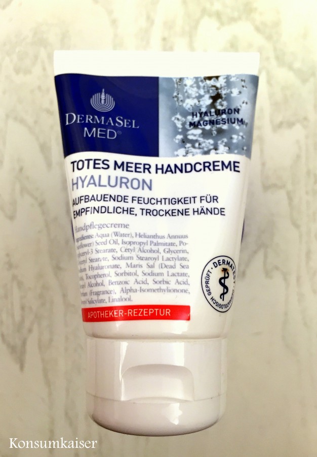 Begeistert bin ich momentan von der Dermasel Med Hyaluron Handcreme! Diese Handcreme pflegt die Hände für kleines Geld wirklich vorbildlich, und das ohne zu schmierig zu sein! Sie macht genau das, was eine gute Handcreme können muss: Sie versorgt die Hände mit der richtigen Menge Feuchtigkeit UND Fett, sodass man aber später auch gleich wieder am Computer arbeiten oder ein Glas anfassen kann, ohne Spuren zu hinterlassen. Ausserdem MUSS die Haut der Hände SOFORT nach Anwendung gepflegt und weicher aussehen. Klappt alles prima mit Dermasel. Parfum ist zwar drin, aber man nimmt es kaum wahr, es riecht einfach angenehm nach Creme.