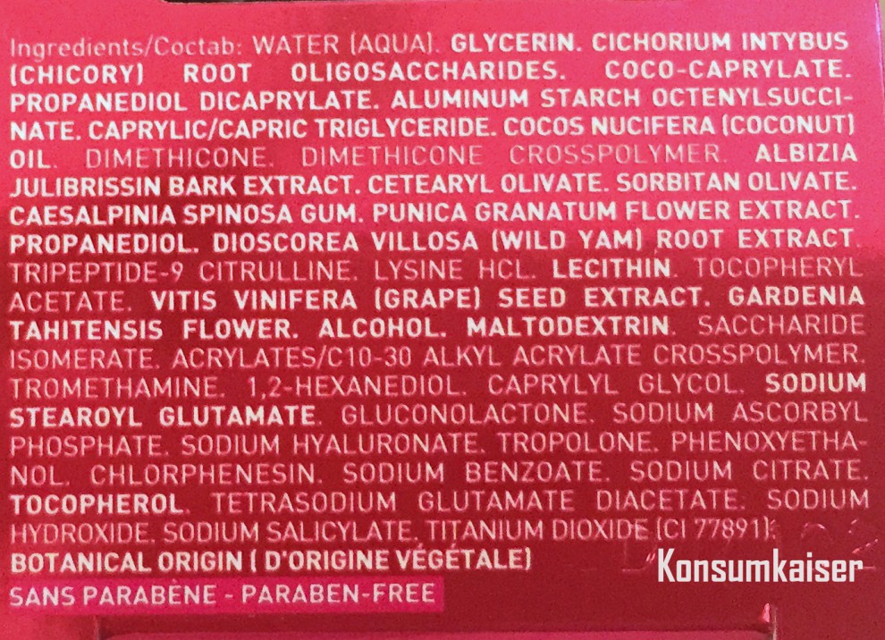 Die Verträglichkeit war bei mir mustergültig, auch wenn mir so manche Inhaltsstoffe Kopfzerbrechen bereiten. Ich würde sie aber nicht bei sehr empfindlichen Hauttypen empfehlen, und auch von der Verwendung zu nah am Auge und auf dem Oberlid rate ich ab.