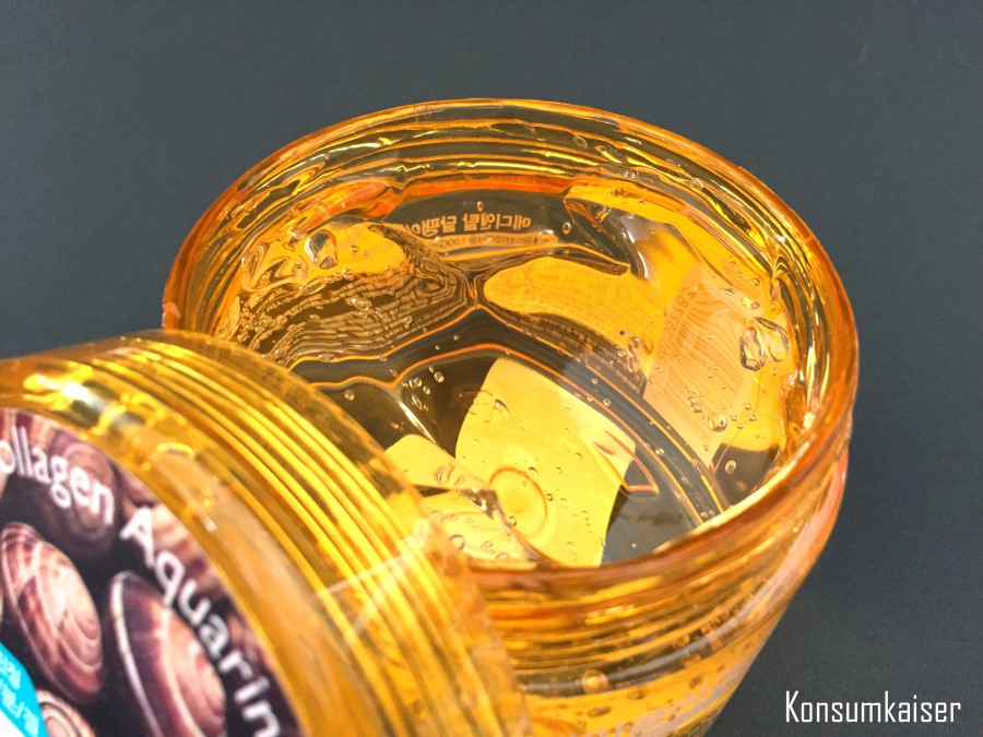 Der Topf sieht aus wie diese Haargel-Töpfe, die man noch mancherorts im Ausland bekommt. Riesig viel drin und ziemlich atemberaubend (wortwörtlich). Das ist beim Dr. Post „Schnecken Collagen Gel“ auch der Fall. 300 ml ist schon eine Menge, und schraubt man den Decke auf (Achtung! Das Gel läuft förmlich heraus) strömt mir ein intensiver, wenn auch frischer, Duft entgegen. Puh, sehr, sehr, sehr äh..frisch. Eben wie solch ein Haargel. Ob mir das gefällt? Zum Glück ist es „nur“ Parfum, nicht noch etliche Duftstoffe, die eigens erwähnt werden müssten.