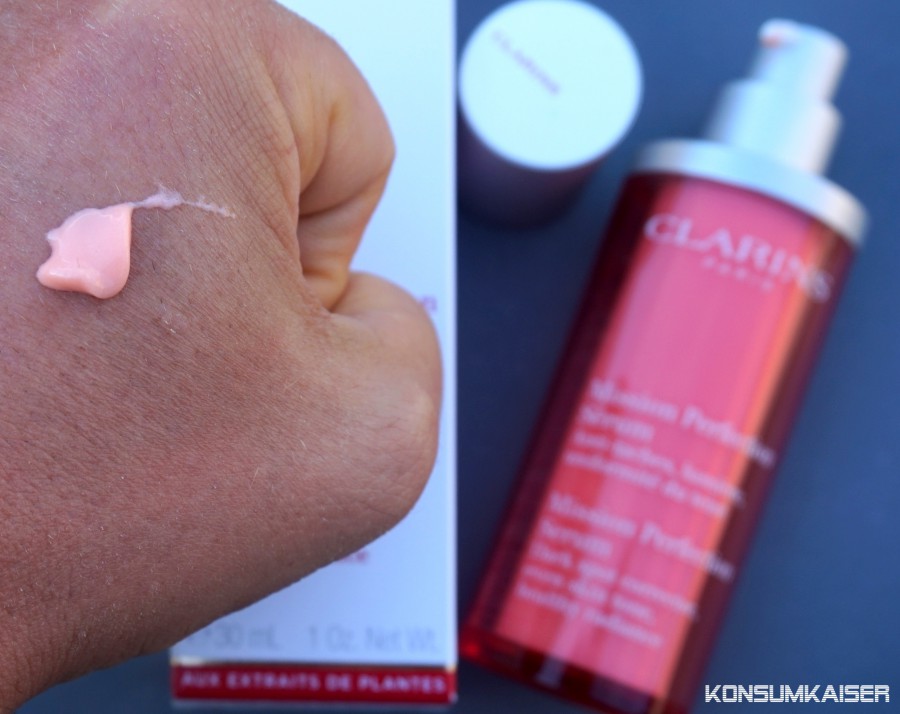 Die Konsistenz ist eher cremig als ein wässriges Serum, im Sommer könnte dies bei normaler- und öligerer Haut bereits ausreichend sein. Trockene Hauttypen tragen vorher noch eine leichte Tagescreme auf. (Ich empfehle, entgegen der Clarins Meinung, die Verwendung als letzten Schritt um die Strahlkraft der Pigmente nicht zu beeinflussen und abzuschwächen!)