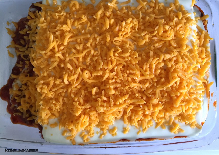 8. Das dann nochmals abwechselnd für drei weitere Schichten wiederholen. Mit Schmand beenden und den Käse zuletzt oben verteilen.