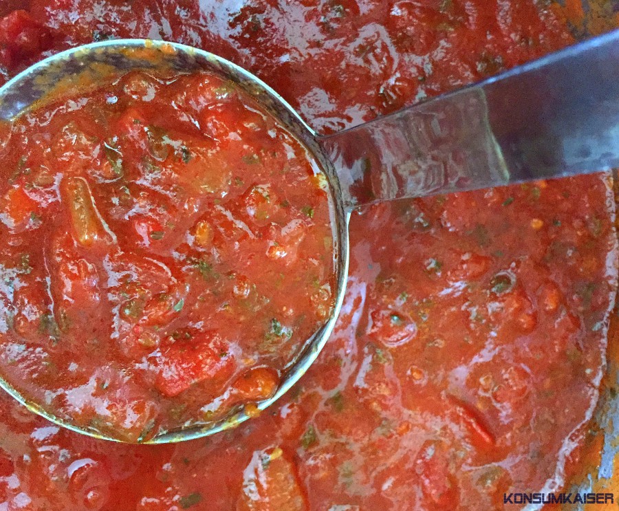 5Tomaten, 1 Zwiebel, 2-3 Knoblauchzehen, gefrorene ital. Kräuter (naatürlich geht auch frisch)