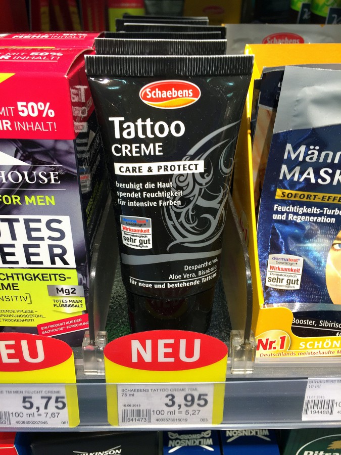 Echt jetzt? Ne Creme für den tatöwierten Kerl von Welt – beim Rossi um die Ecke? Und warum nur im Männerregal zu finden? Ach ja, Frauen lassen sich ja nicht tätowieren. Und kommt das nicht ein klitzekleines Bisschen spät??