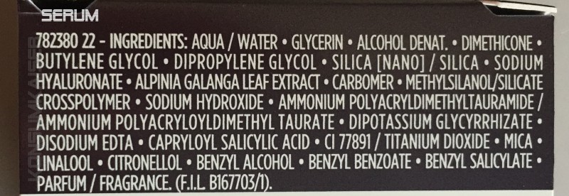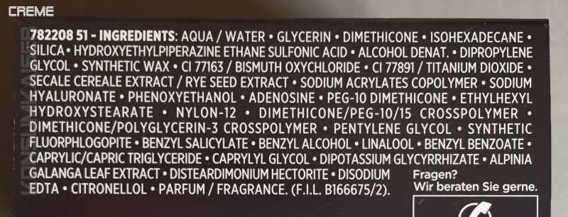 Serum (sehr gelig, irisierende Partikel) und Creme (etwas festere, reichhaltige Konsistenz) werden nacheinander aufgetragen. Beides zieht gut ein und hinterlässt keine unangenehmen Filme oder gar ein schmieriges Gefühl. Trotz der vielen Silikone ist das Hautgefühl erst einmal durchaus angenehm, es „liegt“ nichts spürbar auf der Haut. Der Duft ist zwar frisch und aktivierend, aber auch sehr stark und noch eine längere Zeit wahrnehmbar. Für meinen Geschmack fast schon wieder zu viel. Schaut man dazu auf die Inhaltsstoffliste wird man auch sofort mit einem Haufen Parfum und deklarationspflichtiger Duftstoffe bestätigt. Keine geringen Mengen, also Obacht bei empfindlicher Haut.