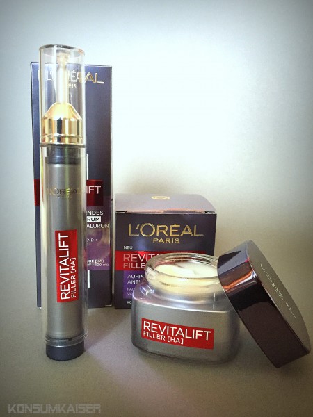 „Revitalift Filler [HA] ist die 1. Produktreihe von L’Oréal Paris mit hochkonzentrierter Hyaluronsäure. Ihre Formel strafft die Wangen, stellt das Volumen nach und nach wieder her und füllt Falten von innen her auf. Ihre nachgewiesene Wirkung hat erstaunliche Ergebnisse geliefert: Nach 8 Wochen ist das Gesicht voller, praller und jünger und weist 12 % weniger Nasolabialfalten, 24 % weniger Stirnfalten und 26 % prallere Haut auf.“