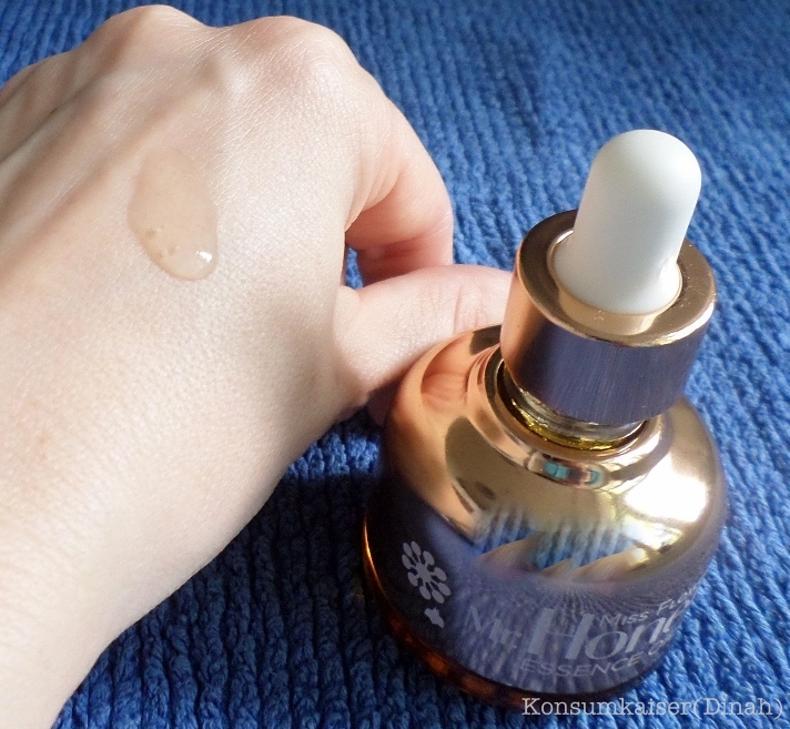 Die bauchige Pipettenflasche in roségold erinnert optisch an Luxuskosmetik und macht sich sehr dekorativ im Badezimmer. Das Essence Oil duftet tatsächlich ziemlich echt nach Honig, sehr angenehm. Es ist relativ dünnflüssig und nur leicht ölig, wenn man es nach dem Schütteln entnimmt. Man kann es mit anderen Pflegeprodukten mischen, aber ich trage es am liebsten gleich nach der Reinigung pur auf, wie eine klassische Essenz, und massiere es kurz ein, bis es eingezogen ist. Bei meiner Wüstenhaut dauert das nur Sekunden. Darüber gebe ich dann meine Seren. Das Essence Oil polstert die Haut optisch etwas auf und verleiht ihr kurzzeitig einen leichten Schimmer, was mir gut gefällt. Wirklich feuchtigkeitsspendend oder nachhaltig pflegend ist es allerdings nicht, da können andere Produkte wie ein Gesichtsöl deutlich mehr.