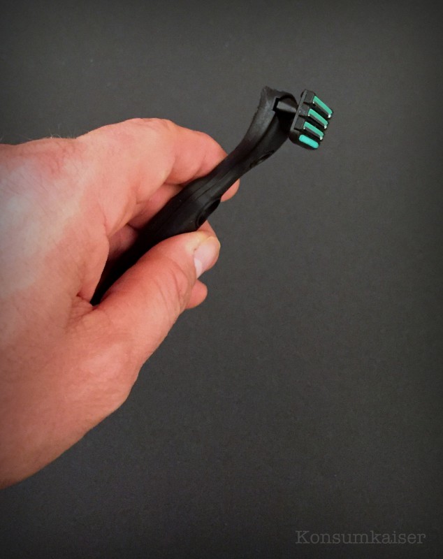 Da hat man(n) tatsächlich endlich mal das Gefühl, dass durch den größeren Klingenabstand die Klinge unterm Wasserhahn wirklich sauber gespült wird. Bei den viel zu eng stehenden Mehrfachklingen der großen Marken (und auch der günstigen Nachahmer) bleibt immer der ganze „Rasierschnodder“ in den Zwischenräumen kleben. 😦 Da wollte ich am liebsten jedes Mal lieber gleich eine neue, saubere Klinge nehmen. Bei dem hohen Preis habe ich dann aber doch lieber zum Zahnstocher gegriffen und die Zwischenräume meist noch mal von Hand nachgereinigt. Komfortabel ist das nicht!! 😦 😦