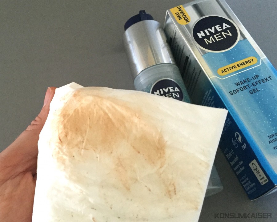 Interessant sind aber wirklich die „Mikrokügelchen“ mit den verkapselten Farbpigmenten. Beim auftragen merkt man nämlich wirklich gar nichts (!) davon. Auch im Gesicht stellt man überhaupt keine Tönung fest. Bei solchen Produkten, habe ich oftmals einen Farbschimmer im Bart, schlimmstenfalls in rötlich schimmernd! Arrgh, geht gar nicht. Hier ist nichts davon zu sehen. Das hat man bei Nivea wirklich geschickt gelöst, denn schaut man sich das verriebene Gel mal auf einem weißen Taschentuch an, sieht man durchaus die Farbe: