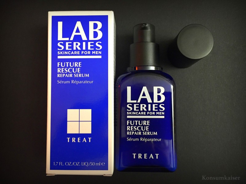 Lab Series ist eigentlich eine Firma (dahinter steht Estée Lauder), der ich seit meiner Zeit in den USA vertraue. Dort sind die wirklich eine Institution und viele Männer mögen und kaufen Lab Series, eben auch, weil die Produkte clean und einfach erscheinen, bei hoher Wirksamkeit. Nun hat mich die wundervolle blaue Flasche ganz schön angefixt, genau wie der Name „Future Rescue“. Also los! Retten wir die Zukunft!?