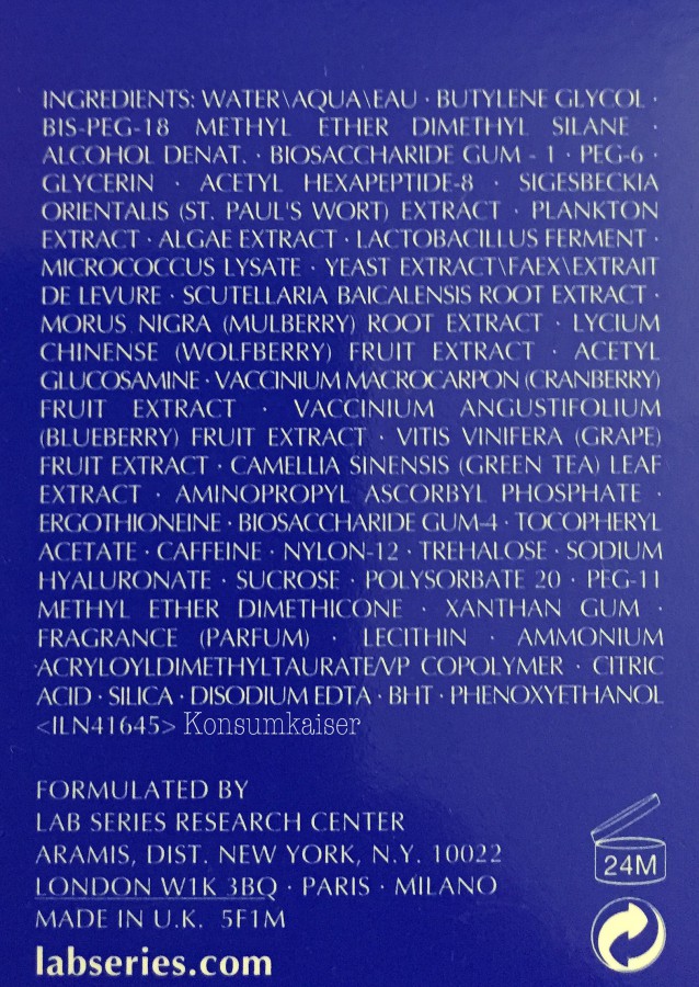 Insgesamt kann ich aber keinen wirklichen Effekt ausmachen. Und das ist blöd: Meine Haut ist ja gerade optimal versorgt und zeigt sich von ihrer besten Seite. Es hätte schon mit einem Wunder zugehen müssen, wenn das Lab Series Produkt hier nochmal etwas verbessert hätte. Trotzdem will und kann ich ihm nun keine Wirkungslosigkeit unterstellen, dafür ist die Menge an Antioxidantien zu imposant. „In Schutz“ nimmt dieses Serum die Haut mit Sicherheit, aber ob das reicht, auch schon bestehende Schäden zu „reparieren“ möchte ich doch stark bezweifeln.