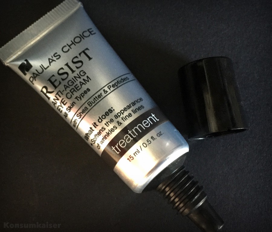 Und da kann die Resist „Anti-Aging Eye Cream“ ganz besonders auftrumpfen! Typisch Paula: Es ist alles drin was „State-Of-The-Art“ ist, mustergültig formuliert, wenn es um die Anti-Aging Wirkstoffe geht! Zu finden sind gute Sheabutter, Glycerin, stabile Vitamine/Antioxidantien (C, E, Resveratrol…), Peptide…usw!
