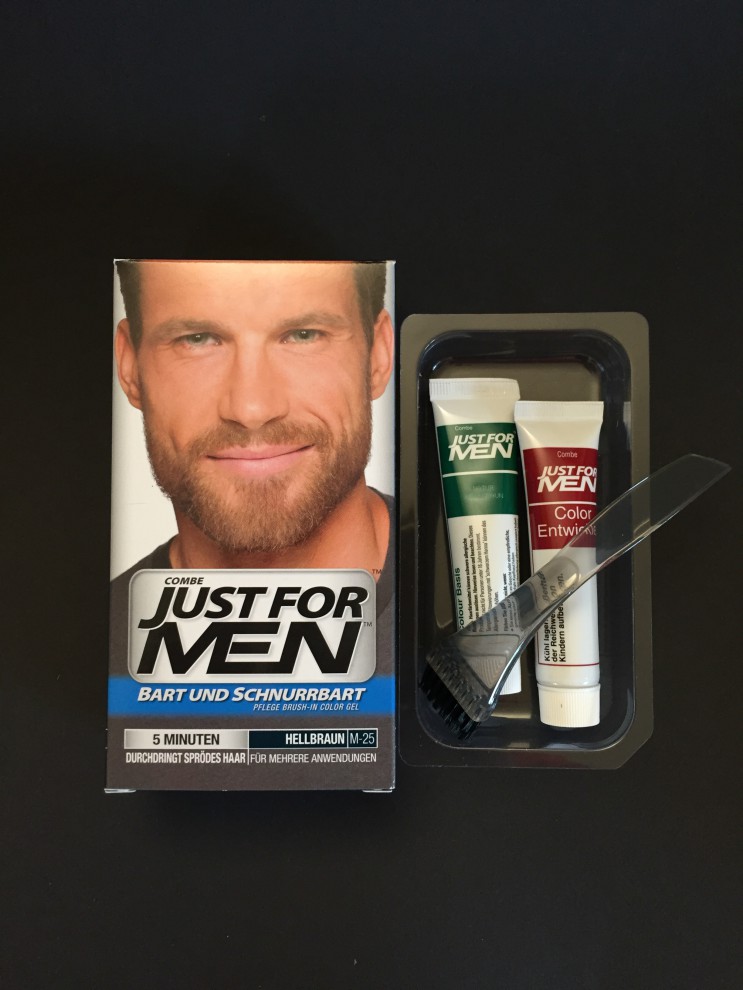 Dazu habe ich bislang immer Wimpernfarbe „missbraucht“. Ist aber teuer und das Ergebnis manchmal eher nicht so langanhaltend. Aber es gibt eine spezielle Bartfarbe für Männer, die ganz besonders gut sprödes Haar durchdringt! „Just For Men“ gibt es in Apotheken zu bestellen und ist eine gute und einfach anzuwendende Peroxid Bartfarbe, die es zum Glück auch in einer recht hellen Nuance gibt! Die Farbe auf dem Foto oben wird eh nie, nie, nie erreicht, es wird IMMER dunkler. Wer es allerdings richtig akkurat besorgt haben möchte, sollte sich zwecks Bartfarbe an den Friseur seines Vertrauens wenden. DER kennt sich mit den korrekten Farben und Peroxidmischungen bestens aus!