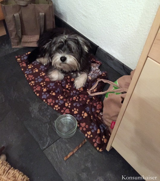 Übrigens haben doch schon wieder Leute gefragt, wie ich den „armen Hund auf dem kalten Boden sitzen lassen kann?“ Nun, wir waren zu Besuch, das ist Luis´ „Ausgehdecke“. Der Boden hat eine Fußbodenheizung und er guckt in „der Fremde“ immer ein wenig skeptisch! 🙂