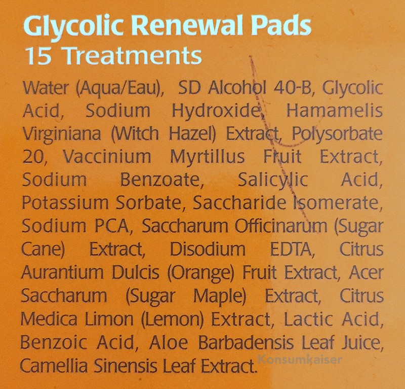 Die klitze-klitze-kleinen Glycolic Renewal Pads sollen ca. 3 x pro Woche verwendet werden. Und da wird mir schon der Hals recht eng, denn an 2. Stelle der Inhaltsstoffe findet sich hier SD Alcohol, also der denaturierte „schlechte“ Alkohol, welcher in dieser Konzentration schon sehr bedenklich sein kann. Ich habe es trotzdem ausprobiert, und wurde nach 5 Tagen mit einer rot blühenden Nase (Rosazea + fettiger Glanz) belohnt. Ich denke, dass ich hier den „Schuldigen“ bereits dingfest machen konnte: Diese Pads! Bleibt mir noch zu erwähnen, dass die Pads sicherlich nicht den geringsten Peeling-Effekt haben werden, denn der pH-Wert liegt auch hier deutlich zu hoch (ca. 4,5). Gleiches gilt für die Salizylsäure, welche zumindest noch anti entzündlich wirken kann. Es finden sich auch hier potenziell reizende Zitrusextrakte.