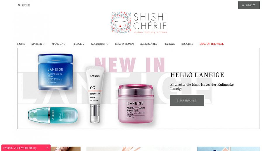 Noch betrachten die meisten europäischen Kosmetikhändler koreanische und japanische Produkte als zu exotisch für ihre Kundschaft – doch das ist auch eine Chance für innovative Skincare-Fans, die sich zutrauen, ins Online-Geschäft einzusteigen. Lucy Leiter aus München bietet in ihrem Shop Shishi Chérie seit 2015 eine interessante Auswahl koreanischer und japanischer Kosmetik und Hautpflege an. Bestellt habe ich dort noch nicht, aber ich habe mal ein bisschen im Angebot gestöbert.