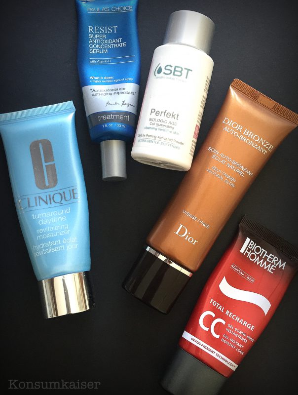Biotherm Homme „Total Recharge CC Gel Instant Healthy Look“ Ein frisches Gel (Achtung: Alkohol) mit lichtreflektierenden Partikeln, das selbst Männerhaut ebenmäßiger erscheinen lässt. Keine Farbe ist zu sehen, also kein Make-up Effekt. Ich mochte es, habe es aber immer nur „bei Bedarf“ verwendet, weil der Alkohol schnell einen Rosazea-Schub auf meiner Nase auslöst. Nachgekauft wird das Produkt nicht, da ich ein ähnliches Gel (von Nivea, leider auch mit Alk) verwende, das günstiger und noch sichtbarer wirksam ist. (30ml kosten ca. € 40,00 in Parfumerien oder Biotherm Online)