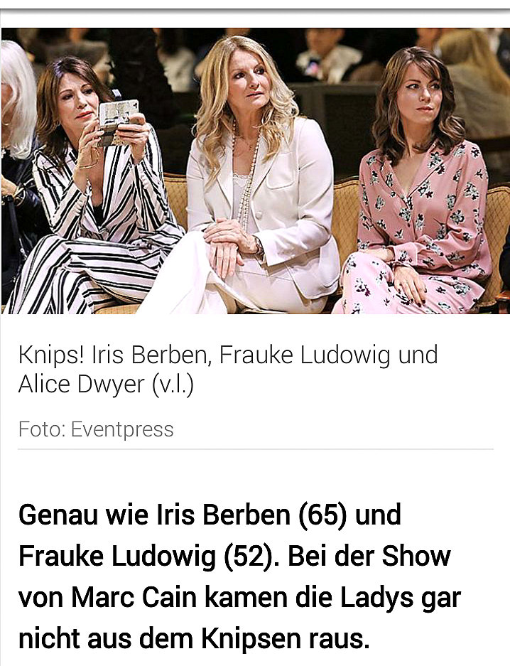 What? Wo waren die drei…äh..Grazien? Auf der Fashionweek? Die sind in Wirklichkeit doch morgens früh aus ihrem Bett entführt worden und wurden – unter Drogen – in die Frontrow gesetzt. Bei „Marc Cain“?? Danach noch „Tom Tailor“ und „Deichmann“? So ein Aufriss, aber wir merken uns: Als Promi sieht man selbst im Schlafanzug beim billig Designer gut aus… Und wenn es nur die Presse behauptet. Was wissen wir schon…? 🙂