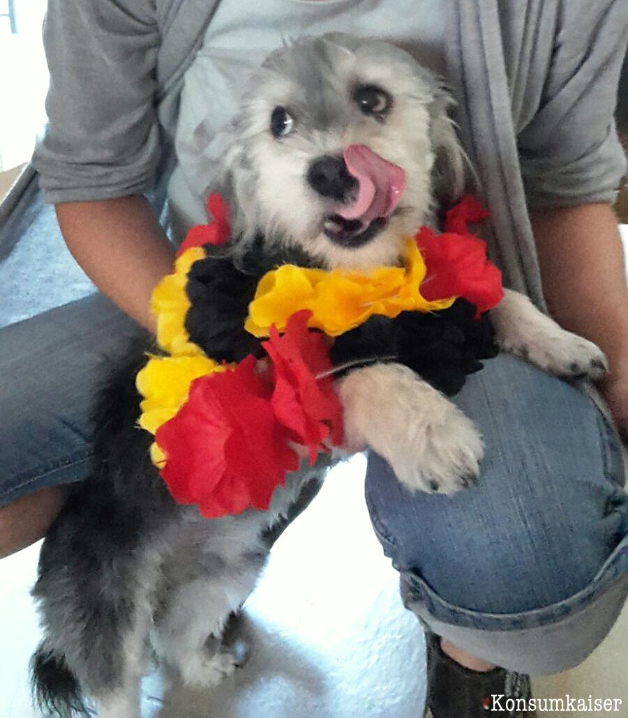 Luxuswaschmittel und Highfashion aus dem Sanitätshaus. Mir fehlen die Worte. 😀 Und der kleine Luis mit der schwarz-rot-goldenen Blumenkette ums Haupt, wie süüüß.