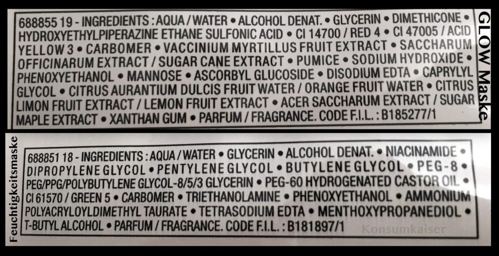 Es gibt da nur ein „kleines“ Problem für mich: Die Masken enthalten (typisch L´Oreal) echt viel Alkohol, und teilweise eine Menge anderer potenziell reizender Stoffe. Das muss ich erst einmal vorsichtig ausprobieren.