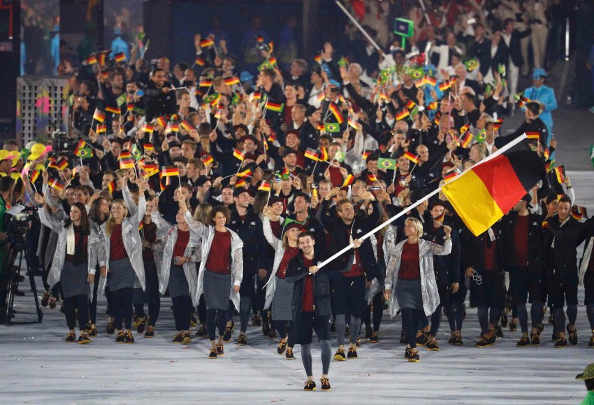 Deutschland wurde auch bejubelt. Aber was bekam man zu sehen? Welcher farbenblinde Design-Praktikant hat denn da bitteschön die Originalentwürfe dreist weggeschmissen und seine eigenen halbfeuchten Träume an die deutschen Sportler gehängt?