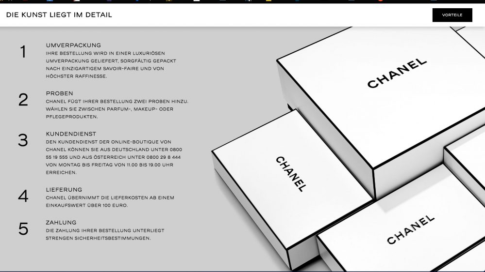 Beauty ist angesagt, ein mega Trend und auch deutlich erschwinglicher (relativ) als edle Designer Couture. Der Inbegriff von Luxus in Mode und Beauty ist CHANEL, da führt kein Weg dran vorbei. Und da eine echte Chanelista immer auf dem neusten Stand sein will, wenn es um Produktneuerscheinungen geht, kommt diese Nachricht natürlich wie gerufen: CHANEL hat jetzt eine wirklich gut gemachte Onlineboutique, in der man auch Raritäten und limitierte Produkte kaufen kann. Bezahlt wird mittels Kreditkarte, Sofortüberweisung, Giropay (Paypal nur per App). Der Versand ist ab 100,00 Euro kostenfrei (ansonsten 10,00 Euro). Und das Wichtigste: Jeder Kauf wird in edlen CHANEL Boxen verpackt und verschickt. Allein DAS ist schon Versuchung genug:
