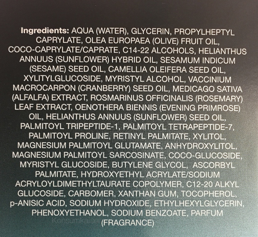 Schade, schade, schade! Ich muss so anfangen, denn ich habe mir hier wirklich mehr versprochen. Aufgrund der spärlich eingesetzten Wirkstoffe, schließe ich aber, dass man hier einfach wieder auf „Nummer sicher“ gegangen ist. Retinol birgt ein hohes Risiko für unangenehme Hauterscheinungen, dafür ist es aber auch hochgradig wirkungsvoll. Hier haben wir leider nur die schwach wirksame Form „Retinyl Palmitate“, welches in der Haut erst umständlich umgewandelt werden muss, und dadurch einen Großteil der Wirkung einbüßt. Die enthaltene Menge ist eigentlich auch verschwindend gering, das kann man mit einem Produkt von Garnier (Drogeriemarkt) vergleichen. Dafür ist die Verträglichkeit aber auch hier für den Massenmarkt überschaubarer.
