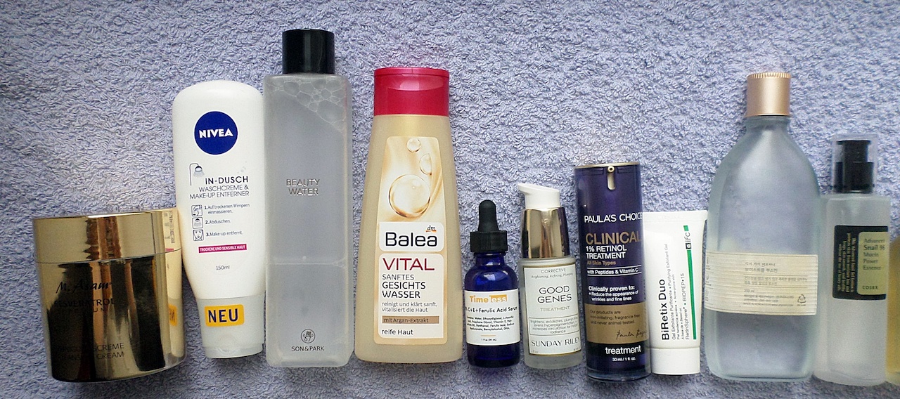 Reinigung: Ich verwende vorzugsweise eine Reinigungscreme oder -milch, die ich mit einem Mikrofasertuch abnehme, und reinige dann mit Gesichtswasser oder Mizellenlotion nach – das ist auch ein Double Cleansing, wenn auch nicht asiatisch. Ich nehme abwechselnd verschiedene Reinigungsprodukte und probiere immer mal was Neues aus. Die Resveratrol Reinigungscreme von M. Asam habe ich schon länger, aktuell benutze ich auch abends gerne die milde In-Dusch-Waschcreme von Nivea und anschließend das Beauty Water von Son & Park oder das saure Gesichtswasser von Balea Vital (ph um 4,0).