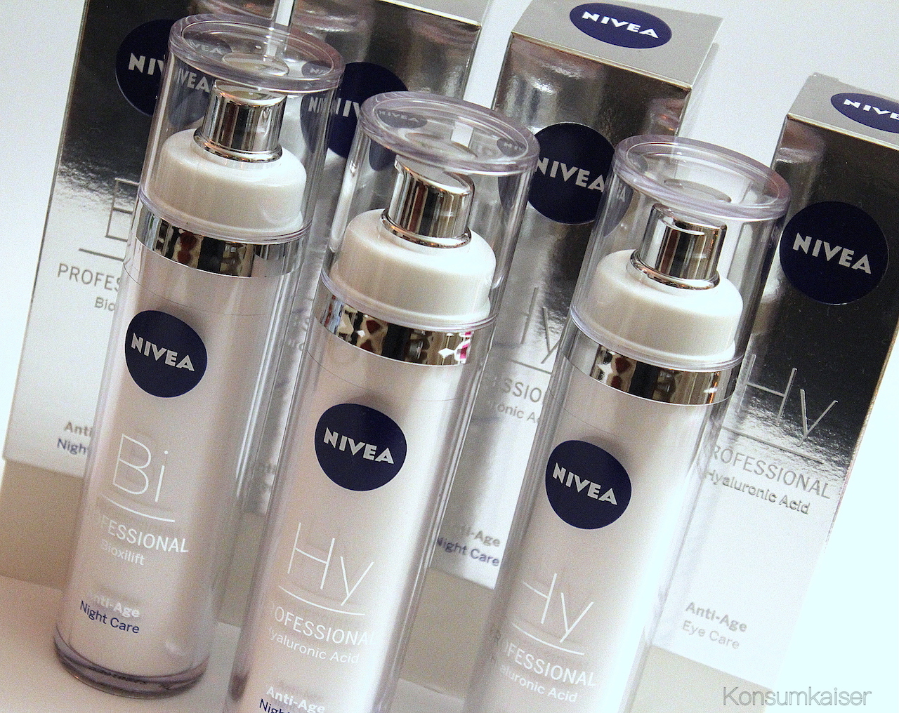 - Nivea Professional „Hyaluronic Acid Anti-Age Day Care“ Feuchtigkeitsspendende Tagescreme für feuchtigkeitsarme Haut, der man Trockenheitsfältchen ansieht. 50 ml im Pumpspender, 24,00 Euro