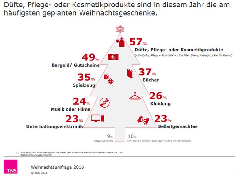 Weihnachten duftet auch in diesem Jahr besonders gut: Beautyprodukte sind das am häufigsten geplante Weihnachtspräsent. Fast 60 Prozent der Deutschen haben vor, Kosmetik unter den Weihnachtsbaum zu legen. Dicht gefolgt von Bargeld bzw. Gutscheinpräsenten, die für jeden zweiten Schenkenden auf der Shoppingliste stehen. Auf den Plätzen drei und vier folgen Bücher und Spielzeug. Das hat eine repräsentative Untersuchung von Kantar TNS und VKE-Kosmetikverband ergeben. 10 Prozent der Befragten wollen in diesem Jahr komplett auf Geschenke verzichten, halb so viele wie im Vorjahr, auch interessant.