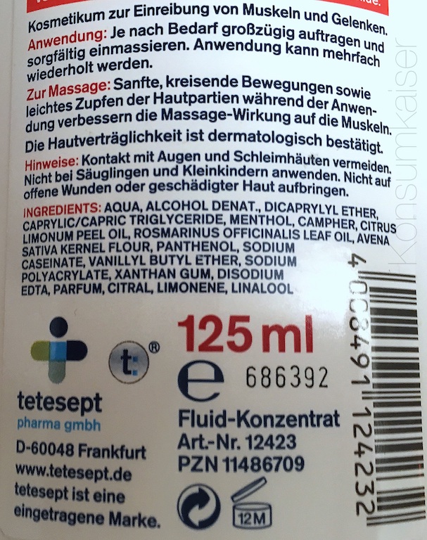 Wie ihr seht, es ist eigentlich nichts besonderes drin. Ätherische Öle, zB. Kampfer, in Mengen. Klar, die haben durchaus eine durchblutungsfördernde und entzündungshemmende Wirkung. Die kleine Massage ist sicherlich auch förderlich. Aber so einen durchschlagenden Erfolg habe ich nicht erwartet. Deshalb wollte ich diesen kleinen Tipp mal weitergeben, vielleicht hilft das Fluid ja tatsächlich noch hier oder da.