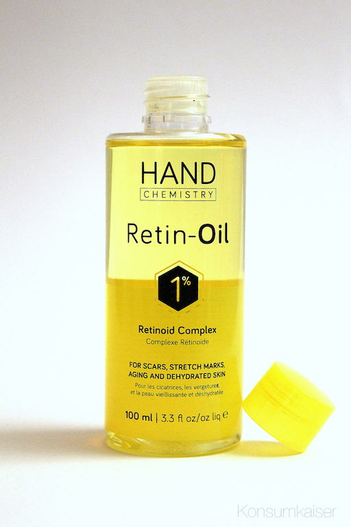 Der Name „Hand Chemistry“ ist ein wenig verwirrend! Man denkt natürlich sogleich an eine Handpflegelinie. Und in der Tat, für die Hände sind die Produkte auch gut zu gebrauchen, aber eben auch für den ganzen Körper. Ganz besonders zum Beispiel dieses „Retin-Oil“, welches zur Pflege von Narben, gegen Dehnungsstreifen, Alterungserscheinungen und Dehydrierung der Haut geeignet sein soll.