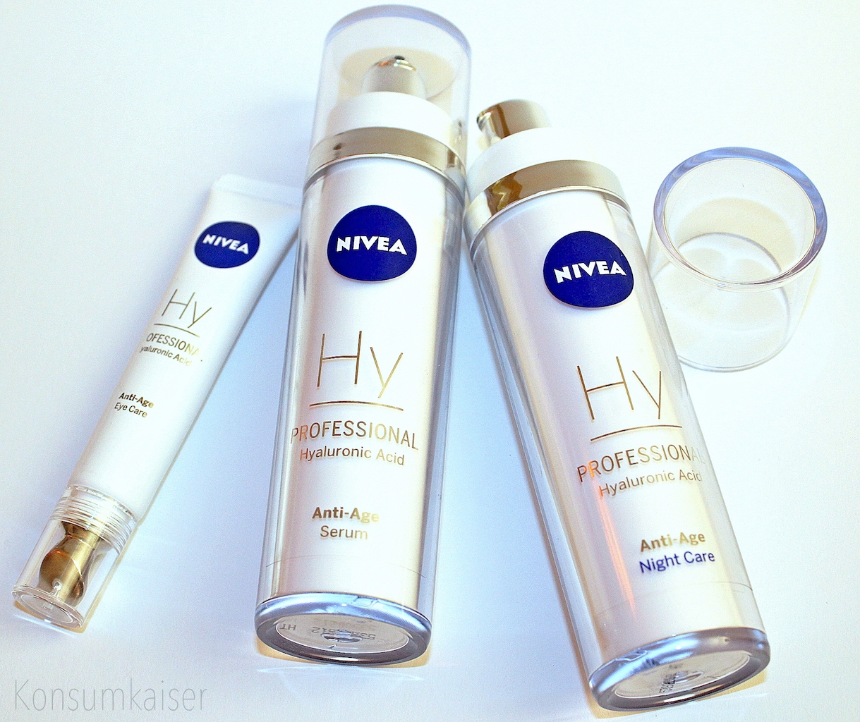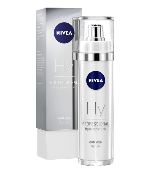 Mit NIVEA Professional Hyaluronsäure hat das Team der NIVEA Hautforschung eine fünfteilige Pflegeserie entwickelt, die den körpereigenen Feuchthaltefaktor Hyaluronsäure in optimaler Konzentration einsetzt, um Falten aufzupolstern und die Haut bis in tiefere Hautschichten mit Feuchtigkeit zu versorgen. Die Produktreihe umfasst: