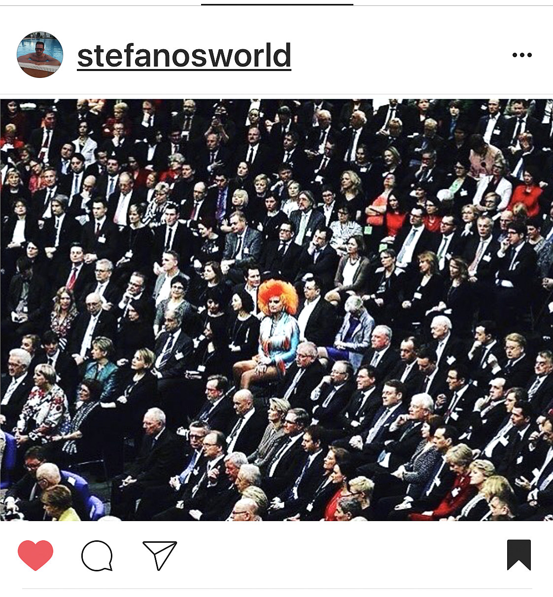 Großartiges Bild. Der bunte Vogel Olivia Jones war bei der Wahl zum Bundespräsidenten dabei. Wenn ich mir die steif-graue Masse so anschaue, komme ich nicht umhin zu denken, dass wir durchaus noch ein paar Paradiesvögel mehr vertragen könnten.