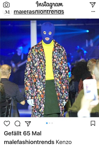 Gute Idee, liebste Kenzo-Designschmiede! In unseren Terrorzeiten macht sich ein solches Outfit echt prächtig. Gut, dass das Model überlebt hat. In die USA wird man wohl dermaßen modern gekleidet nicht mehr einreisen können. *kopfschüttel*