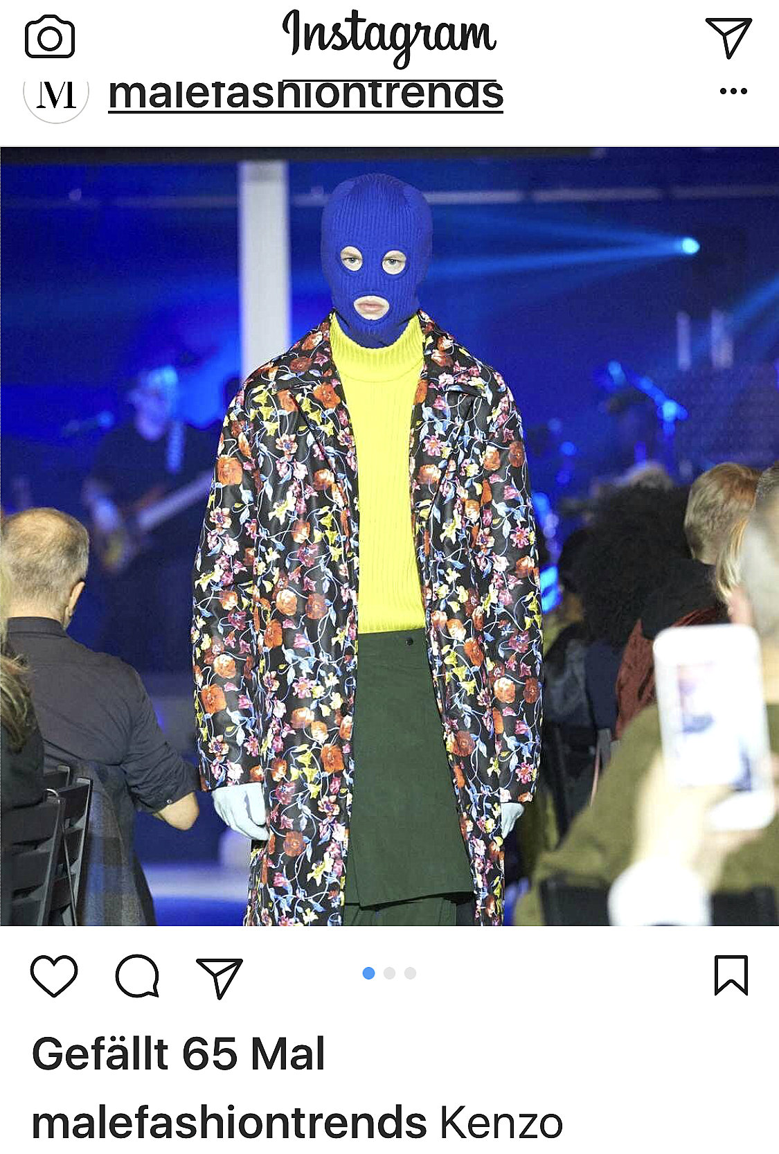 Gute Idee, liebste Kenzo-Designschmiede! In unseren Terrorzeiten macht sich ein solches Outfit echt prächtig. Gut, dass das Model überlebt hat. In die USA wird man wohl dermaßen modern gekleidet nicht mehr einreisen können. *kopfschüttel*