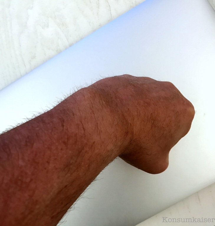 → Die dünne Haut des Unterschenkels ist deutlich beruhigt, weniger gereizt und klar sichtbar geglättet, also weniger rau. Selbst die kleinen Abschürfungen fallen weniger auf. Ein tolles Ergebnis, das ich so voll bestätigen kann, und es wird noch besser, je öfter man die Lotion verwendet.
