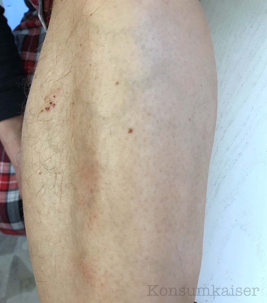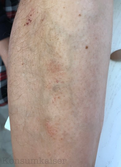 Hier seht ihr nun seinen malträtierten Unterschenkel vor der Behandlung mit der Bodylotion+