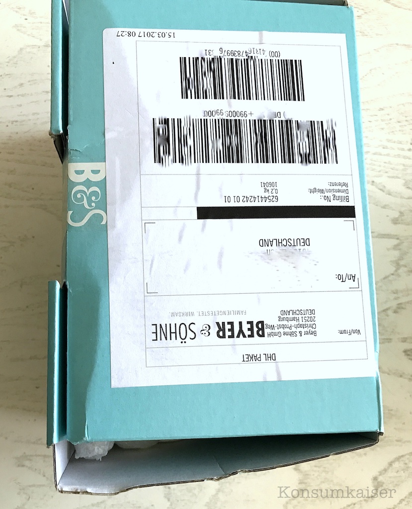 Die Verpackungskünstler von Beyer & Söhne sollten vielleicht einmal ganz dringend bei Christo in die Lehre gehen, denn mein Päckchen kam leider SO (!) bei mir an: Weit offen an den Seiten, nur mit einem (!) kleinen Klebestreifen in der Mitte gesichert. Ein Wunder, dass das Produkt noch in der Schachtel war. Da kann man noch was verbessern…